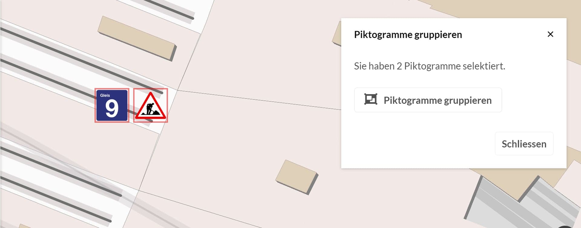 Wussten Sie, dass sich Piktogramme zu Gruppen zusammenfassen lassen? Die Funktion ist wichtig, wenn Piktogramme ihre relative Position zueinander beibehalten sollen, wenn die Karte gezoomt wird. Zum Gruppieren halten Sie die CTRL-Taste (Apfel-Taste bei Mac) gedrückt und klicken nacheinander die zu gruppierenden Piktogramme an. Darauf erscheint ein Dialog, mit dem die Gruppierung eingestellt werden kann. Wenn Sie eine Gruppe von Piktogrammen anklicken, erscheint direkt dieser Dialog, mit dem die Gruppierung rückgängig gemacht werden kann.